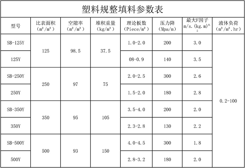 塑料孔板波紋填料按其比表面積及角度不同分為125Y(X)、250Y(X) 、350Y(X) 、500Y幾種型號(hào).其中X代表波紋傾角為300,Y型代表波紋傾角為450。