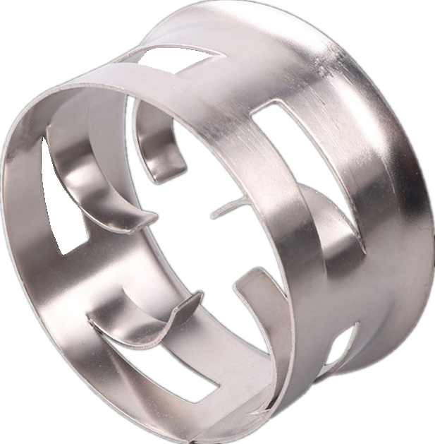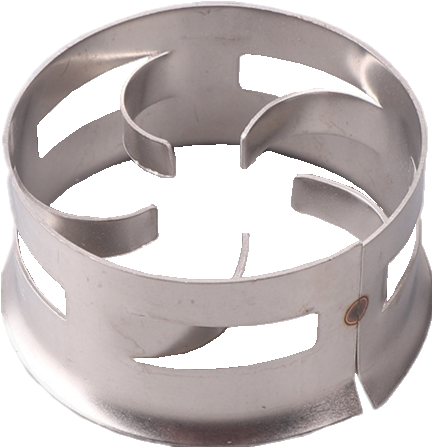 階梯環(huán)的高徑比僅為鮑爾環(huán)的一半,并在環(huán)的一端增加了錐形翻邊,這樣減少了氣體通過床層的阻力.并增大了通量,填料的強度也較高,由于其結(jié)構(gòu)特點,使填料層內(nèi)填料間多呈點接觸。這樣既增大了空隙率、減少了壓降,而且又構(gòu)成了液體沿填料表面流動的匯集或分散點,促進液膜表面更新和液體混合作用,使氣液分布均勻,增加了氣液接觸表面而提高了傳質(zhì)效率,一般由塑料、陶瓷、金屬做成。材質(zhì)不同,結(jié)構(gòu)也有所不同,金屬階梯環(huán)內(nèi)筋結(jié)構(gòu)同鮑爾環(huán),舌片彎向呈葉片狀;塑料及瓷質(zhì)階梯環(huán)的內(nèi)筋結(jié)構(gòu)與塑料鮑爾環(huán)相似,也有米字形和井字形之分。