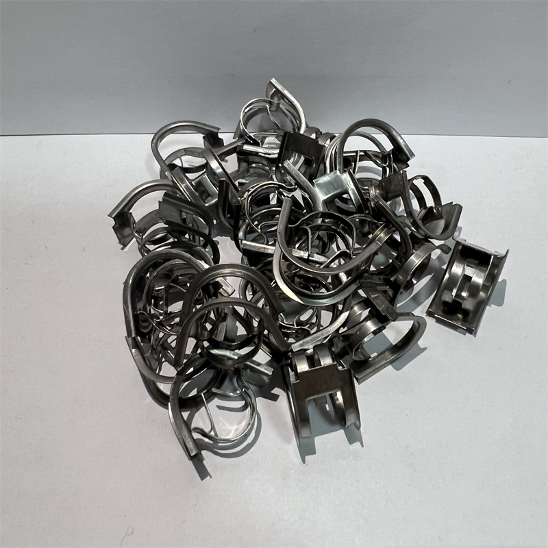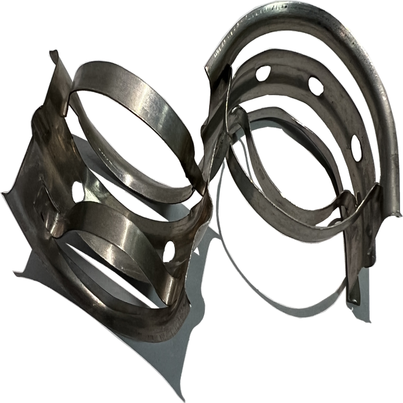 金屬矩鞍環(huán),它是綜合了環(huán)型填料的液體自分布能力和鞍型填料的通量提高的兩種不同填料的優(yōu)勢,開發(fā)出來的新式結構填料。金屬矩鞍環(huán)填料是在鞍玵填料的坯料上沖壓了鞍形筋,并在扇面中間沖出幾個半環(huán)和小爪,從而形成了開孔型填料的側壁開孔和舌形葉片。因為它的特殊結構,不但保留了鞍型填料的圓弧形氣道,其設計結構各個方面的開孔都很大,從而更有效的提高更多的均勻流體通道,有利于氣、液流均布及降低了流動的阻力,提高了處理效率。從另一方面來講,它具有較多的接觸點作為液體匯聚和分散 ,更加有利于液膜的表面更新,也促進了傳質效率的提高。因此,基于以上金屬矩鞍環(huán)的設計優(yōu)勢,不但有效提高了它的處理能力,壓降和效率,操作彈性也顯著提高