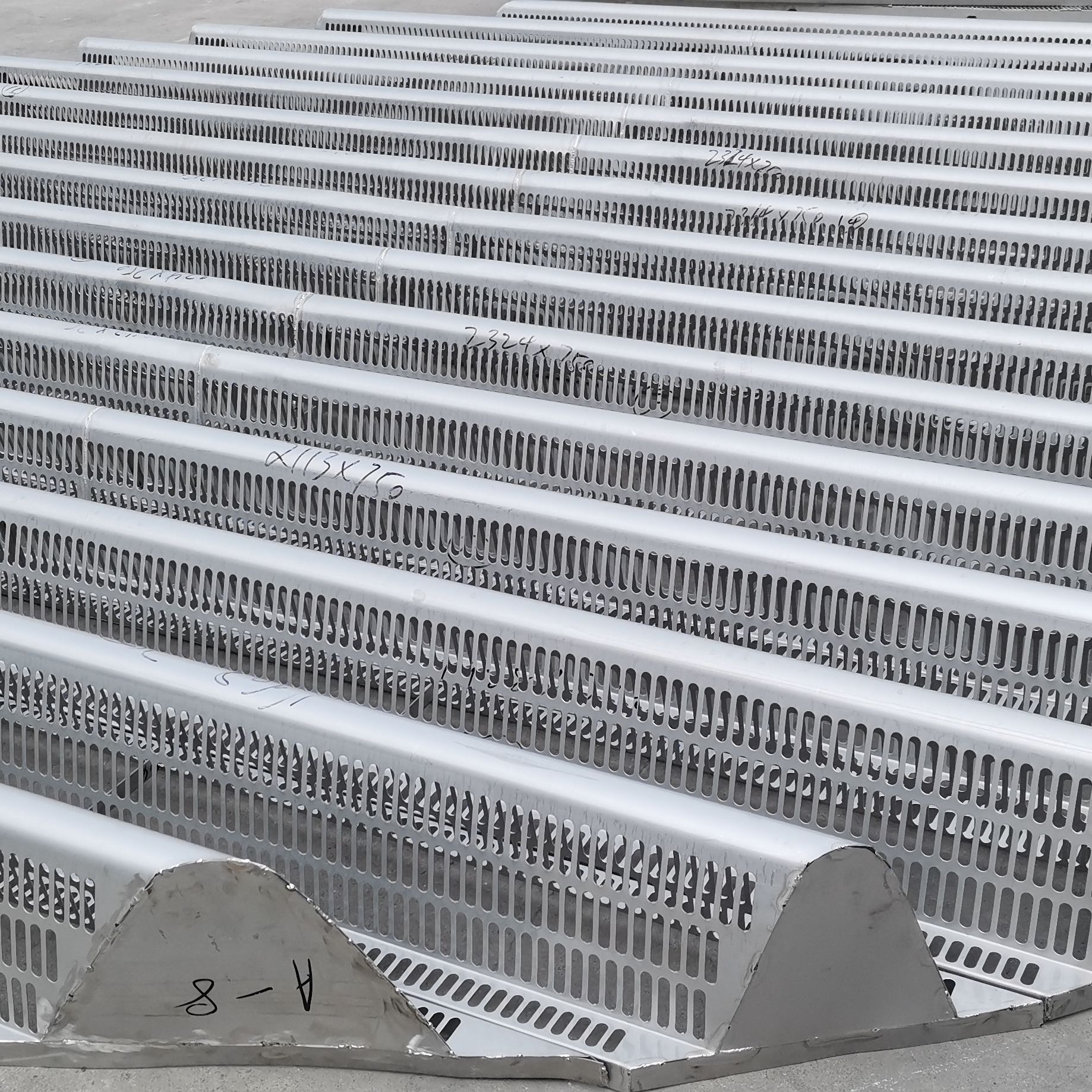 駝峰支承板又稱駝峰式填料支撐板,也叫梁型氣體噴射式填料支承板,為單體組合式結(jié)構(gòu)。它是目前較好的散堆填料支承之一,適用于塔徑1.5米以上的大塔,應(yīng)用較廣。能從人孔直接進(jìn)入塔內(nèi)。單體在塔內(nèi)放置由凸臺定距,間隙10mm,使液體自由流下。駝峰具有長條形側(cè)孔,用鋼板沖壓成型,其液體通量可達(dá)200m3/m2h,最大壓降為69Pa,適用于25mm以上的各種散堆填料。憑借駝峰支撐的優(yōu)異性,其應(yīng)用范圍廣,被迅速應(yīng)用于煉油、化工、化肥、乙烯和制氧等領(lǐng)域,除此之外,還有鐘罩型支承,波紋板網(wǎng)支承和格柵式支承等類似產(chǎn)品。