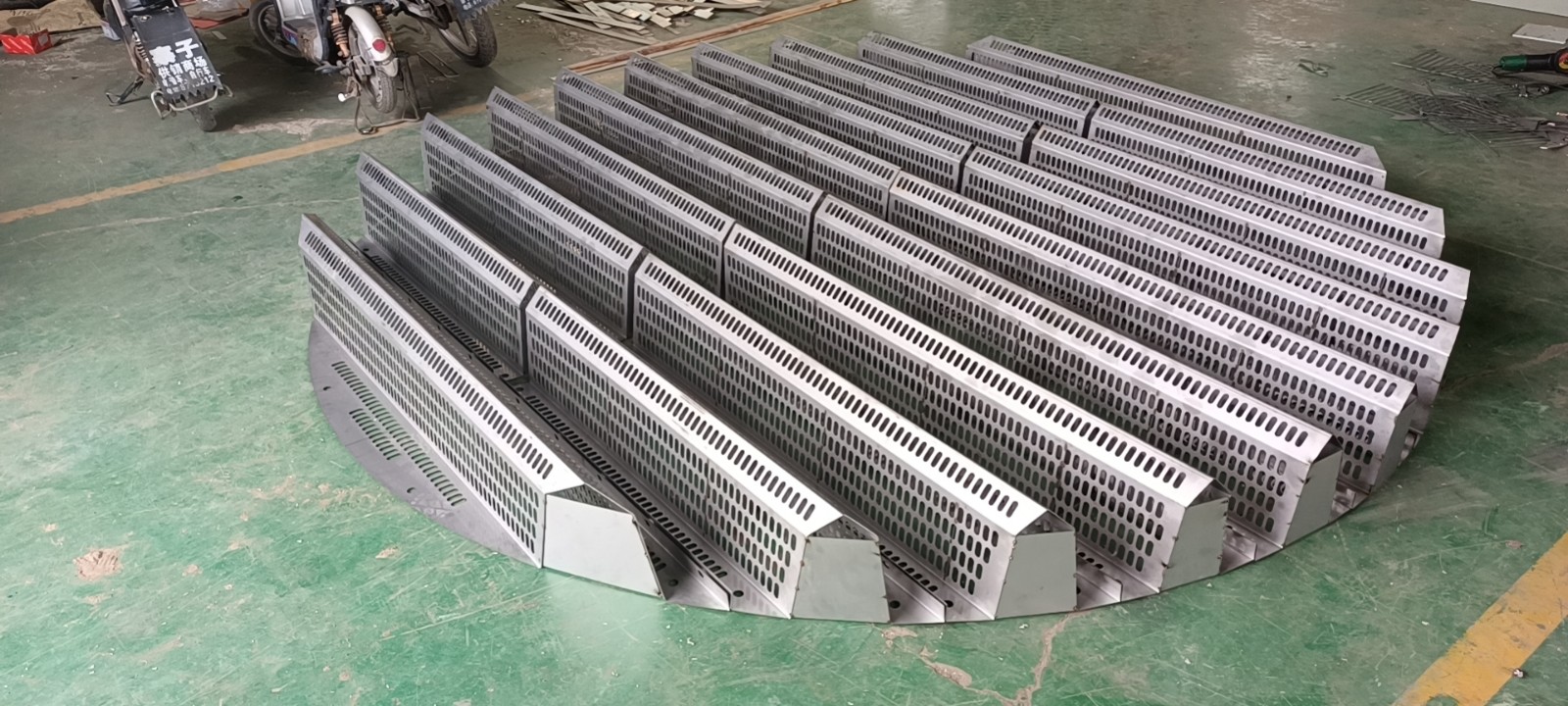 (6)其立體結(jié)構(gòu)的支承板,有利于加大開孔面積,使開孔面積多在100%左右。開孔面積的原則是開孔率必須大于填料層的空隙率,否則支撐板構(gòu)成“瓶頸”區(qū),使塔負(fù)荷降低,開孔面積與結(jié)構(gòu)、材質(zhì)、塔徑有關(guān),一般占塔截面的70%-100%,對金屬支承板應(yīng)100%左右。