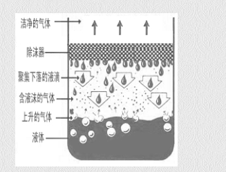 在通常的化工操作中所碰到的氣體中分散液滴的直徑約在0.1~5000μm。一般粒徑在100μm以上的顆粒因沉降速度較快,其分離問(wèn)題很容易解決。通常直徑大于50μm的液滴,可用重力沉降法分離;5μm以上的液滴可用慣性碰撞及離心分離法;對(duì)于更小的細(xì)霧則要設(shè)法使其聚集形成較大顆粒,或用纖維過(guò)濾器及靜電除霧器。絲網(wǎng)除沫器,其主要用于分離直徑大于3μm~5μm的液滴,工作原理如右圖所示。當(dāng)帶有霧沫的氣體以一定的速度上升,通過(guò)架在格柵上的金屬絲網(wǎng)時(shí),由于霧沫上升的慣性作用,使得霧沫與細(xì)絲碰撞而粘附在細(xì)絲的表面上。細(xì)絲表面上的霧沫進(jìn)一步擴(kuò)散及霧沫本身的重力沉降,使霧沫形成較大的液滴沿著細(xì)絲流至它的交織處。由于細(xì)絲的可濕性、液體的表面張力及細(xì)絲的毛細(xì)管作用,使得液滴越來(lái)越大,直至其自身的重力超過(guò)氣體上升的浮力和液體表面張力的合力時(shí),就被分離而下落,流至容器的下游設(shè)備中。只要操作氣速等條件選擇得當(dāng),氣體通過(guò)絲網(wǎng)除沫器后,其除沫效率可達(dá)到97%以上,可以達(dá)到完全去除霧沫的目的。